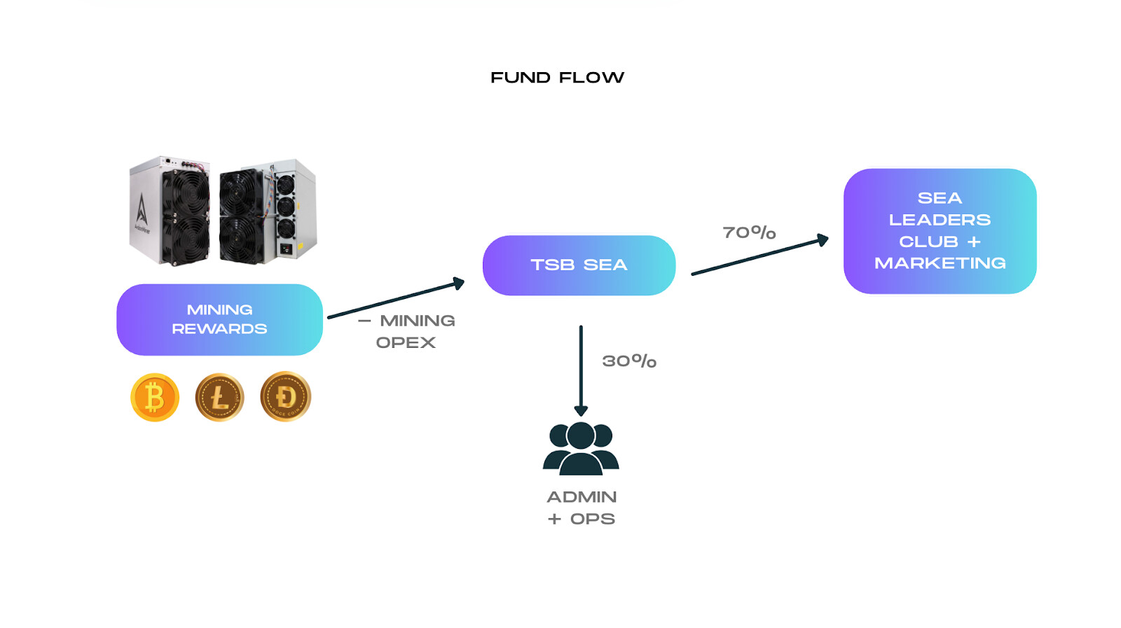 The TSB SEA Community Initiative operates on a lean, transparent structure powered by mining-generated inflows and community participation. It replaces centralized operations with a community-governed model that keeps Southeast Asia active, creative, and self-funded.