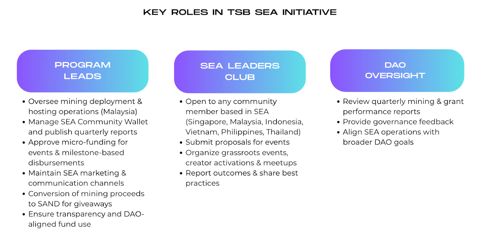 The TSB SEA Initiative establishes a community-led, mining-backed model to sustain The Sandbox ecosystem in Southeast Asia. Mining rewards will generate recurring inflows to fund grassroots activations, content creation, and creator incentives without relying on centralized budgets. The initiative will transfer management of existing SEA marketing channels to appointed community leaders, supported by transparent micro-funding and partial conversion of mining proceeds into SAND for rewards and campaigns. This creates a self-sustaining funding loop that keeps The Sandbox brand active, visible, and continuously growing in the region.